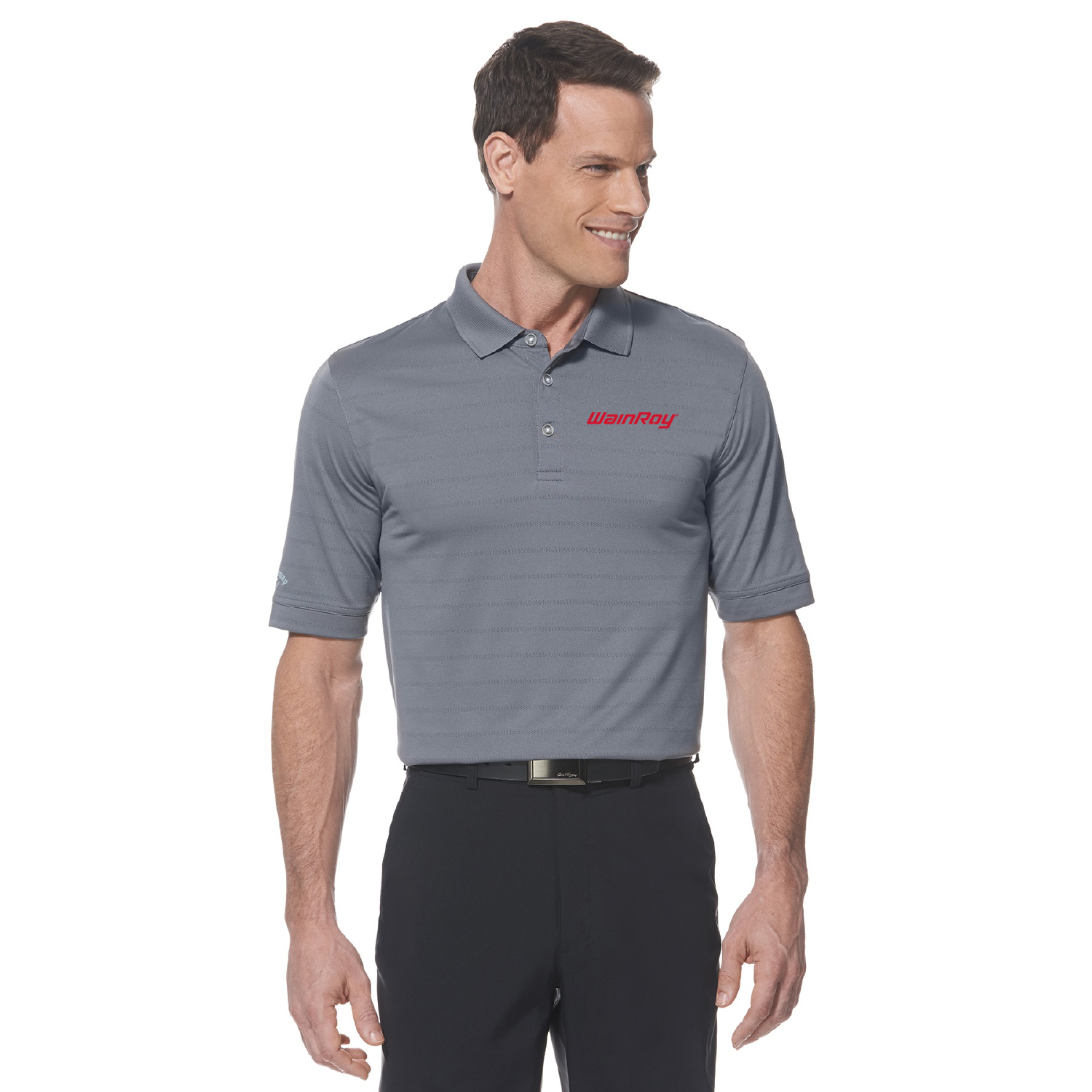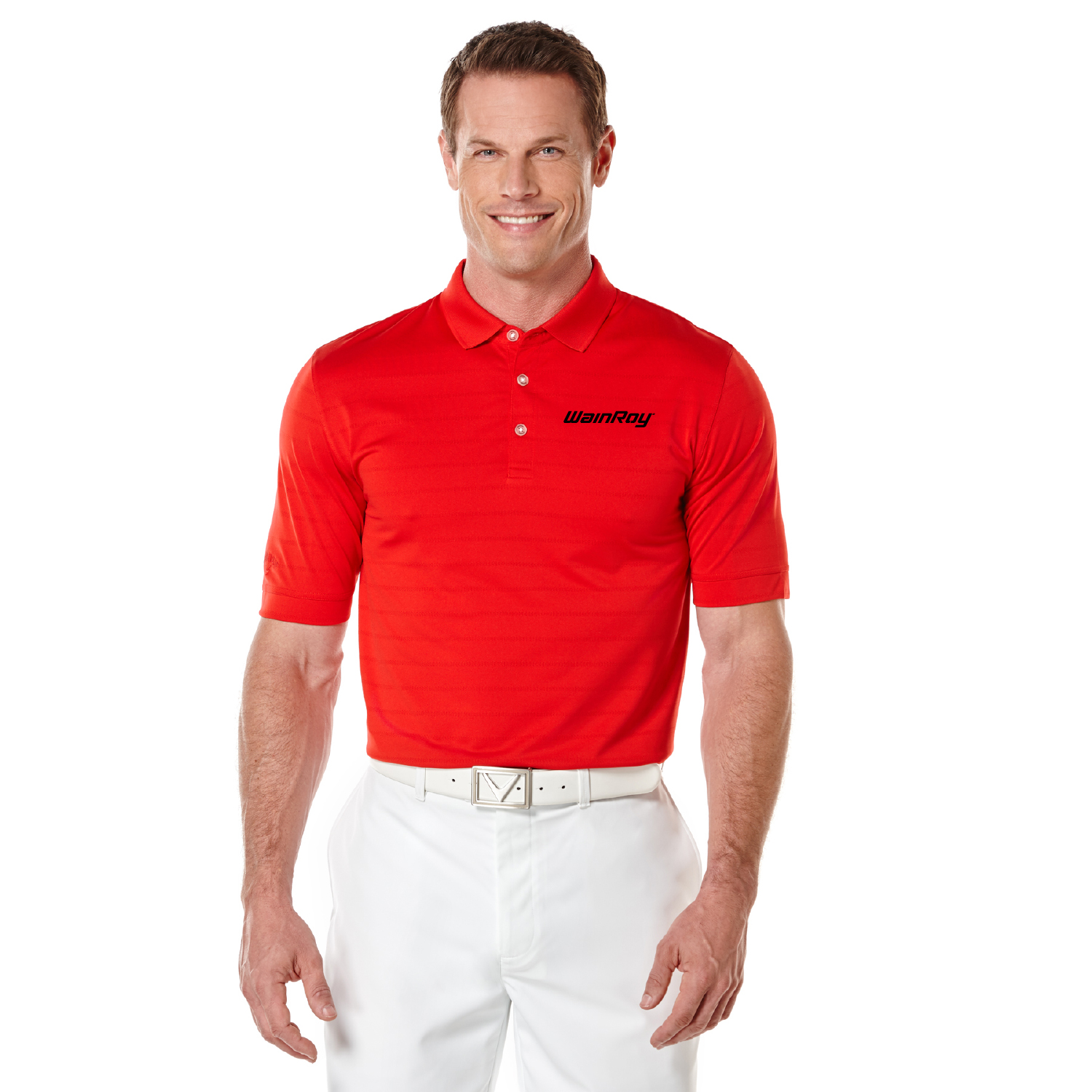 5.3 oz 100% polyester pique mesh stripe knit fabric. Opti-Dri technology transfers moisture away from the body to keep you cool and dry. Ventilated fabric allows air to flow freely through the fabric to keep you comfortable. Rib knit collar. 3-button placket with Callaway embossed buttons. Double needle hemmed bottom with side vents. Heat seal label provides tag-free comfort. Contrast embroidered Callaway logo on right sleeve.